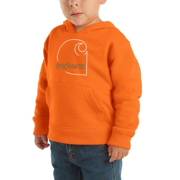 The Carhartt Fleece Pullover Logo Hoodie for kids is crafted from a midweight fleece blend of cotton and polyester for cozy warmth and comfort. This hooded sweatshirt features raglan sleeves for easy movement, ribbed trim at the cuffs and hem, and a kangaroo pocket for stashing small essentials. The printed Carhartt logo graphic adds a touch of rugged charm to this everyday essential.