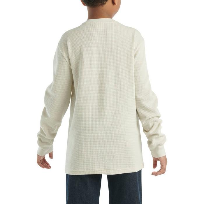 The kids' Carhartt Long Sleeve Henley Pocket T-Shirt is a heavyweight thermal top crafted from a comfortable, warm cotton blend. The rounded ribbed knit collar includes a three-button placket for classic henley appeal. The twist-minimizing side-seam construction ensures a more ergonomic fit and long-lasting wear that holds its shape. The smooth tagless neck label at the inner collar eliminates any potential for irritation to further enhance comfort.