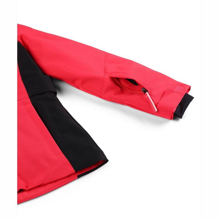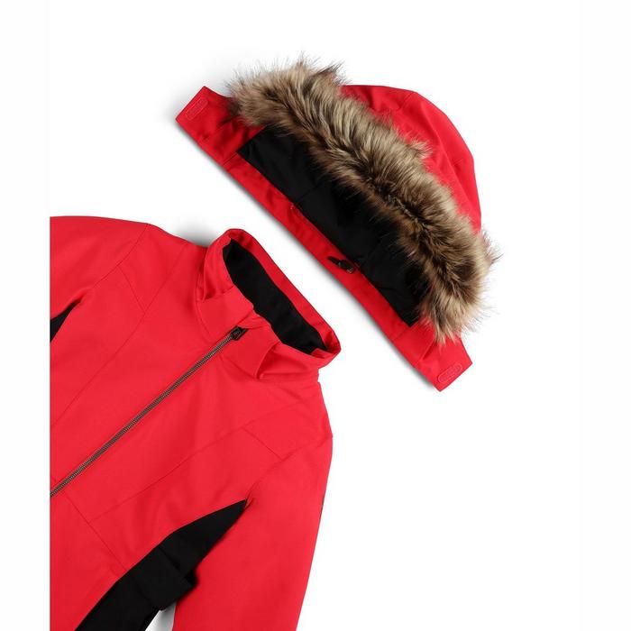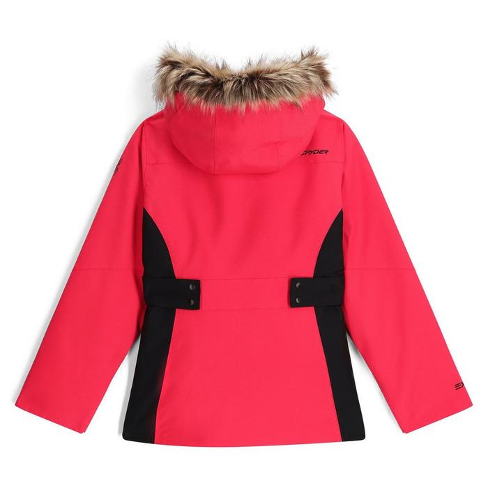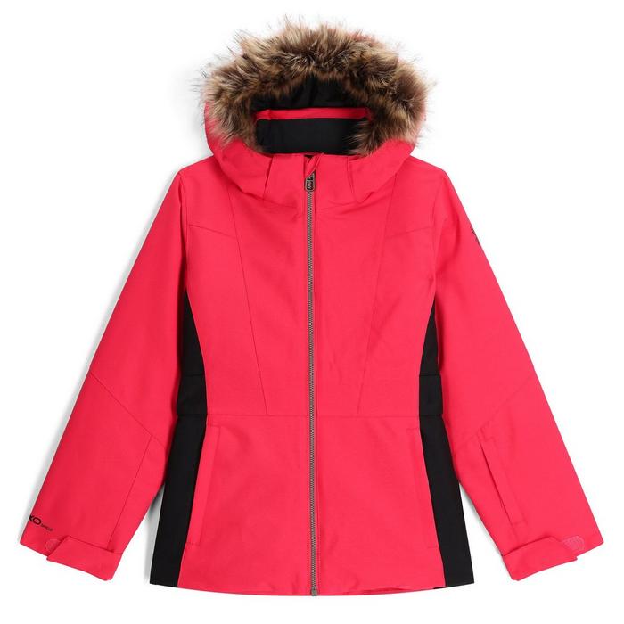 The girls' Spyder Lola Jacket is ready for both everyday wear and winter sports like skiing and snowboarding. It's made from stretch recycled polyester plain weave fabric, offering flexibility and sustainability. The EXO Thermo synthetic insulation ensures warmth, while the waterproof EXO Shield technology and 10k/10k weatherproofing laminate provide excellent protection against the elements. The kids' Spyder Lola Jacket also features a PFC-free durable water repellent finish and is critically seam taped for added durability. The removable helmet-compatible hood with an inner gaiter and detachable faux fur trim offers style that can be switched up in a flash. This Spyder jacket also features a YKK Metaluxe centre front zip closure, inner stretch cuffs with thumbholes, adjustable cuff tabs, and a fixed powder skirt with snaps and gripper elastic.