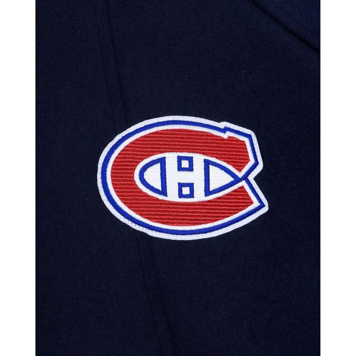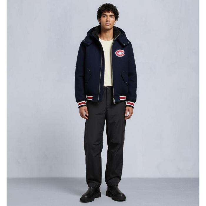 Pay homage to a hockey dynasty with the men's Moose Knuckles Montreal Canadiens Bomber Jacket, a standout jacket from the exclusive NHL x Moose Knuckles collaboration. This Moose Knuckles jacket's wool-blend shell and powerful 800-fill RDS-certified down insulation deliver serious warmth and long-lasting durability. Get extra cozy with the removable hood, trimmed with genuine shearling and a sherpa-lined collar. Team-coloured ribbed cuffs and hem scream team spirit with a sporty, retro vibe. Finished with official NHL and Canadiens patches, this Moose Knuckles bomber is a true collector's item for any devoted fan.
