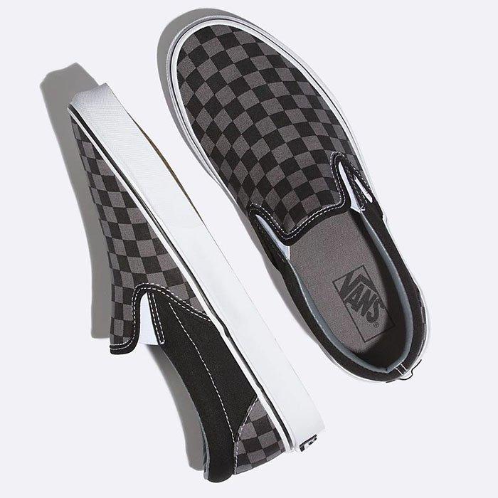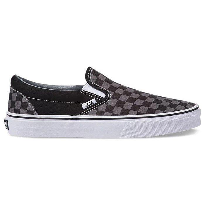 Featuring the iconic Vans checkerboard print, the Classic Slip-On is an everyday essential with true "Off The Wall" style. This shoe also includes low profile canvas uppers, supportive padded collars, elastic side accents and signature rubber waffle outsoles.