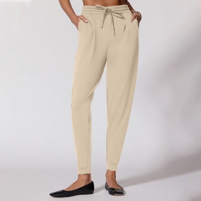 MPG's Serene High Waist Jogger Pants for women are responsibly made, offering a light stretch and breathability that's perfect for your active lifestyle. The luxurious soft feel of the fabric will make these your go-to pants for both workouts and casual wear. Ethically sourced and produced using socially responsible practices, these joggers also feature multiple pockets for effortless organization of small essentials. The drawstring waist allows you to adjust your fit to tailor your look, while the front pleats give this style a distinctly polished look.