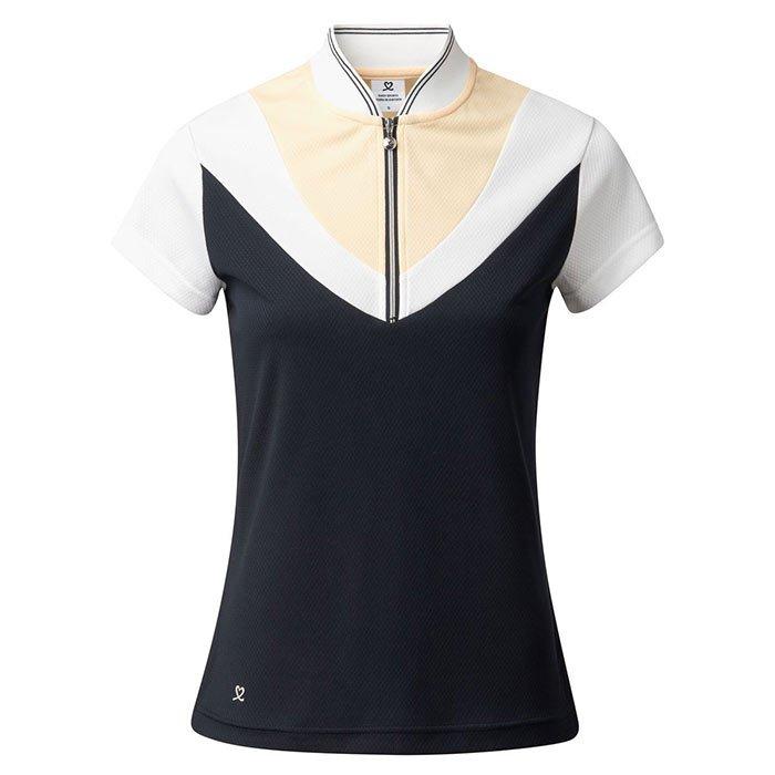 Stay comfortable from first swing to lunch at the clubhouse in the women's Torcy Cap Sleeve Polo from Daily Sports. This stretchy, quick-drying golf shirt features a ribbed mock polo collar with partial front zip closure and 100% recycled polyester fabric.