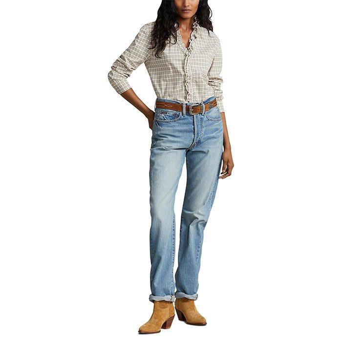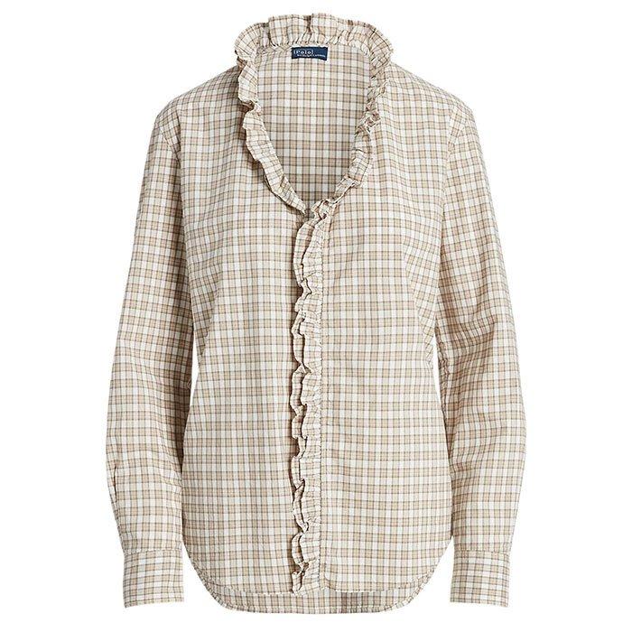 Cut for a straight silhouette, this women's Polo Ralph Lauren cotton shirt is defined by a yarn-dyed plaid motif and ruffled trim.