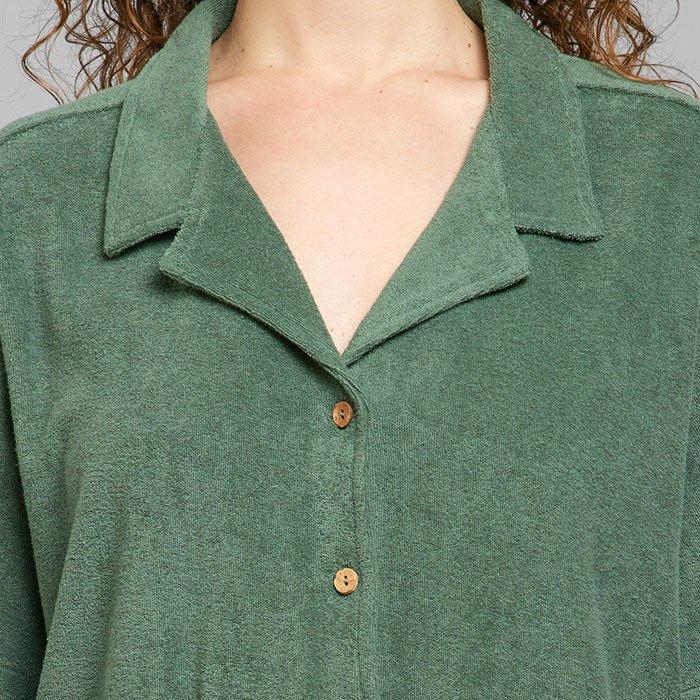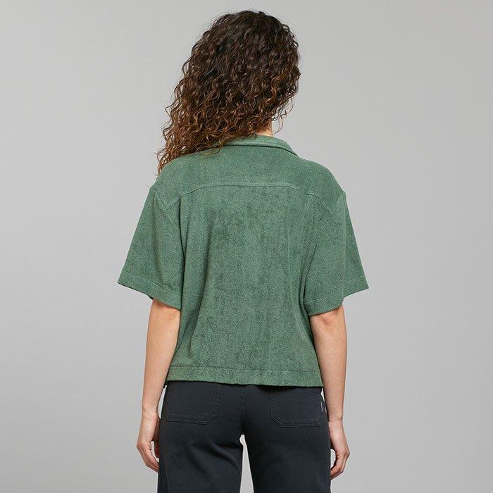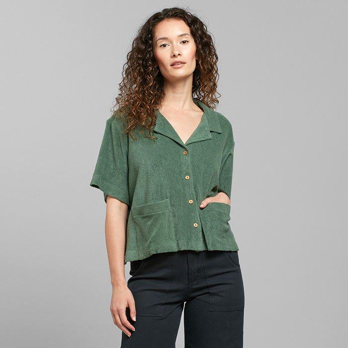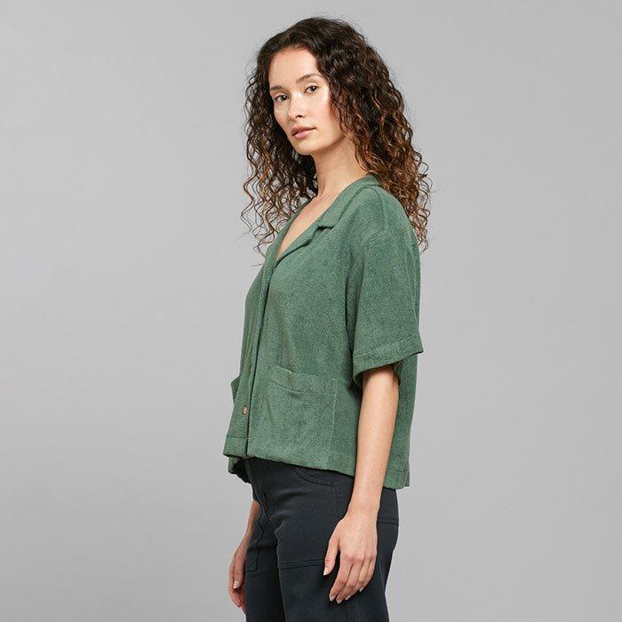 Featuring soft 100% organic cotton terry, the women's Valje Terry Shirt is a short sleeve button-down with resort-ready vibes. Design highlights include a notched collar, two drop-in front patch pockets, and a looser fit for breezy comfort.