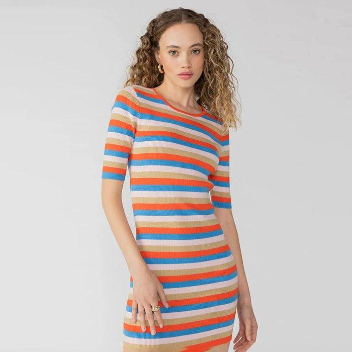 Pour le travail ou le plaisir, la robe côtelée Act Natural de Sanctuary vous donne un look tendance. Cette jolie robe à rayures possède une coupe ajustée, un col ras du cou et des manches demi-longueur.